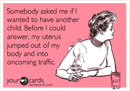 All the women around me thought pregnancy was the healthiest, most beautiful time they ever experienced, which made me feel like a freak, because I enjoyed very little of it. I’m a comfort creature. Being able to sleep on my tummy is important to me. Peeing fewer than twenty times a day is important to me, in addition to not peeing when I cough, sneeze or laugh. Have you ever tried to pee in a cup when you can’t reach your own genitals? I prefer my food leaving my body when my ass is on the toilet, instead of my face. I like being able to sit down and get up without moaning, and I like walking like a person instead of a duck. I couldn’t wait to get that baby out.