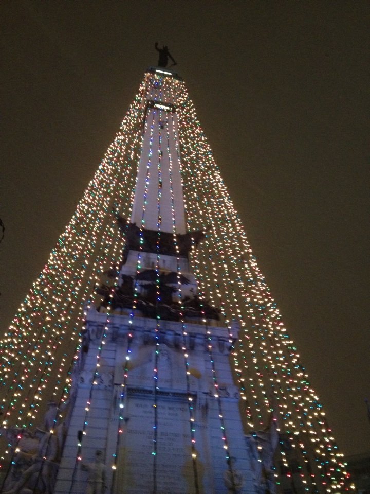 One of the things I love about Indianapolis is our Soldier’s and Sailor’s Monument, which is located in the center of the city, inside a roundabout. On the Friday after Thanksgiving, they “light” the tree, which is composed of stringed lights from top to bottom. It’s quite lovely.