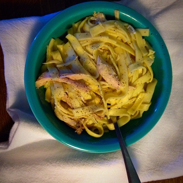 Don’t think you need a recipe, really. Roast chicken, eat chicken, save remaining chicken in a big bag in the fridge for a day or two, boil carcass, drain drippings, add bouillon and water, drop in noodles, add herbs and a pile of salt, add chicken bits — voila!